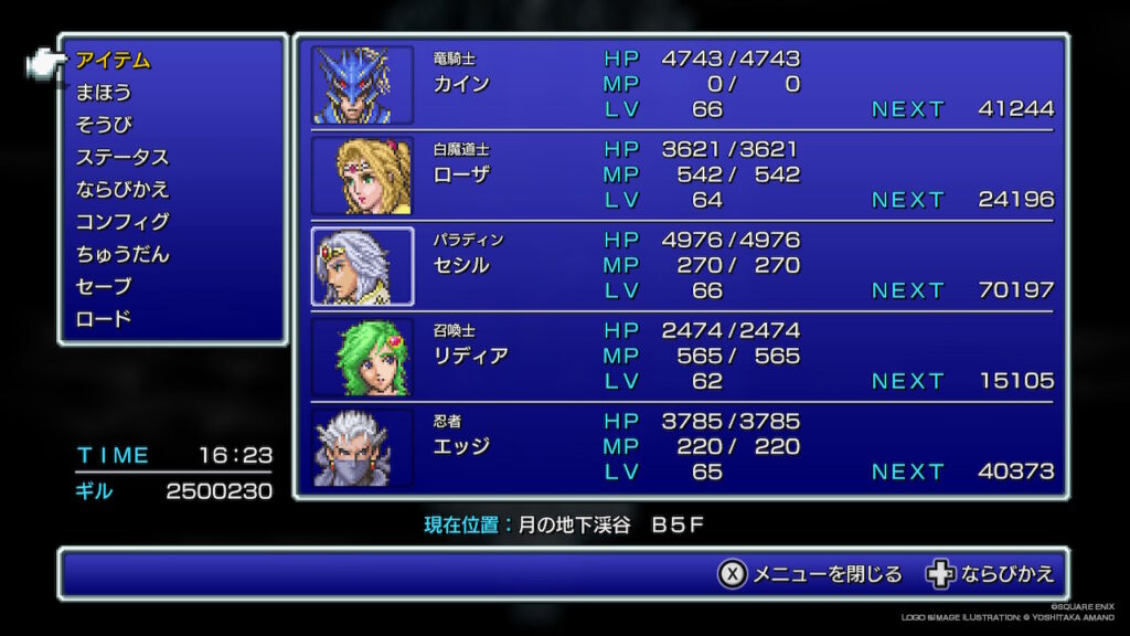 👆はクリア時のパーティですが、結構レベルはサクサク上がります。ダンジョンをくまなく回っていて、宝箱を回収しているうちにレベルも上がっていく感じです。一部後半になると雑魚戦でも苦しい戦闘になったりもしましたが、強い分経験値も多いので苦労することはなかったです。