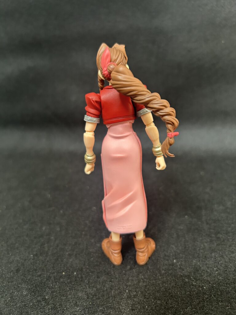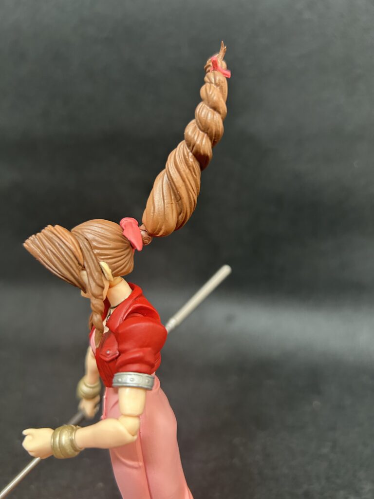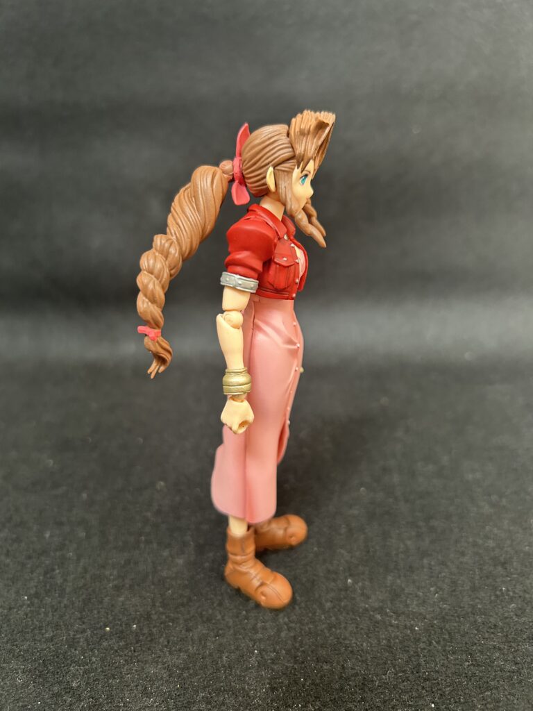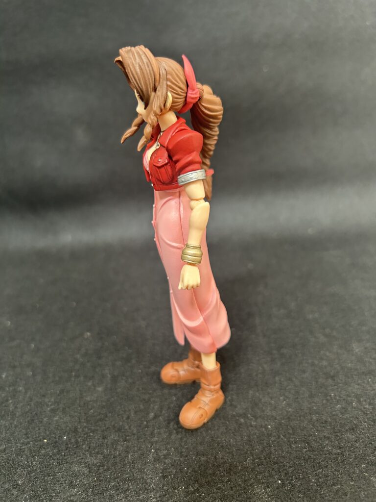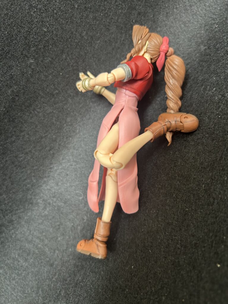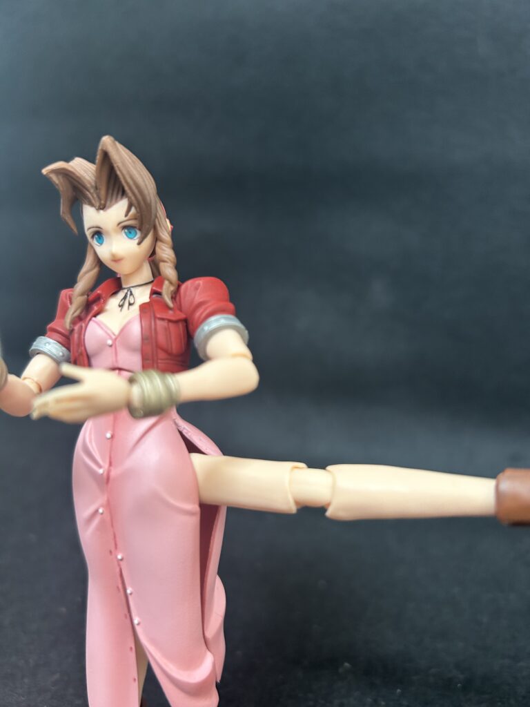 可動については腕、足ともにしっかりと可動します。特に足のパーツはワンピースが可動を阻害するのかなと思っていたのですが、画像のようにスリットとなっていますので足は十分に上げることは可能です。シュールですが💦ちゃんと膝も二重の関節のなっており、しっかり曲げることが可能です。まあエアリスに足を上げるポーズは似合わないですし、原作にもそういったポーズをとっている描写はないのですが(笑)