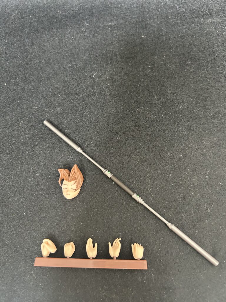 付属品は手首パーツが5種類に祈り顔パーツ、武器となります。武器は毎度造形が細かく、しっかりマテリアが埋めてあるのも再現されています。ちょっと残念ポイントが一つ、表情パーツをはめ込みが緩くかなり頻繁に顔面がポロリしてしまうところですね。個体差かもしれませんが💦ティファの時の顔パーツはしっかりハマっていたので今回のは残念でしたね。後ろ髪のパーツはジョイントがあり可動しますので、表情をつけることが可能です。